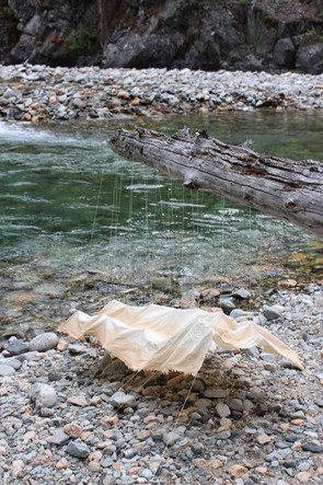 The piece questions how the landscape of this area is continuously formed and reshaped. A towering cedar supports vertical strings, suspending the canvas landscape from above. Twisted into these strings—small objects such as pinecones, leaves, feathers, and a beehive represent some of the plants and animals that play a role in altering the landscape. The wind through the trees from upriver lightly ripples the ridges in the fabric and floats needles into the folds. Under the canvas, strings weighted by decaying needles, a beaver chewed stick, a deer vertebra, bear and deer droppings, and hardware from a washed out bridge represent some of the factors that shape the landscape from below. In a dynamic system that is being pulled and shaped from various directions and by many influences, how do we settle our weight into the complex configuration without snapping strings or tearing holes?
