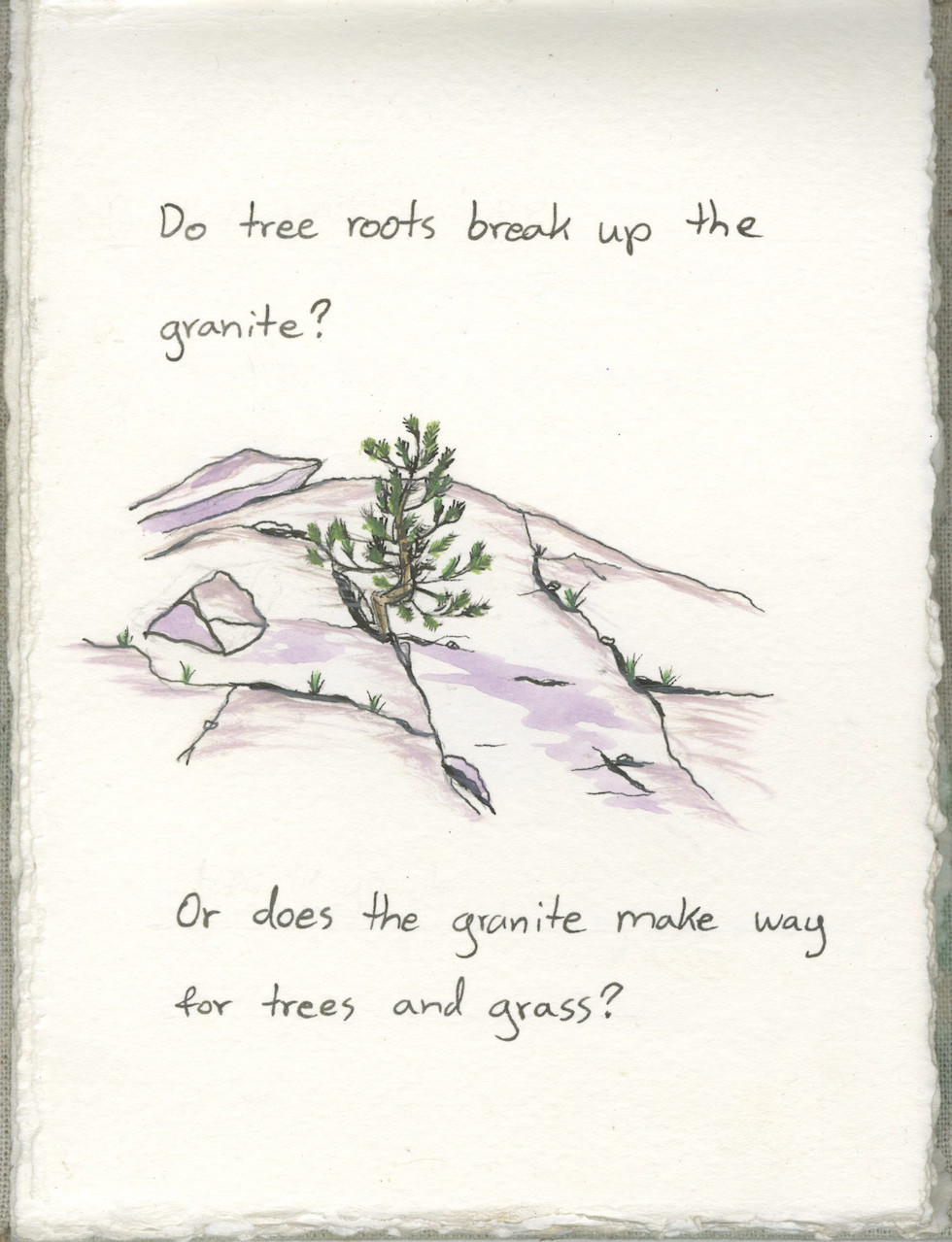 As written in my journal (July 27), the focus of week 3 was inquisitiveness, attentive curiosity, and close observation. I turned my journal entry from July 31st into an illustrated story in a handmade sketchbook. Most of the drawings were completed in an evening and the following day from observation at locations a short walk from camp. I added the text and color while seeking shelter under my tarp from the alternating rain/hail showers and sunshine that defined the week at Tamarack Lake. Though a new format for me and quickly executed, this project was unexpectedly enjoyable and the process of sketching and painting was certainly a highlight of the trip.